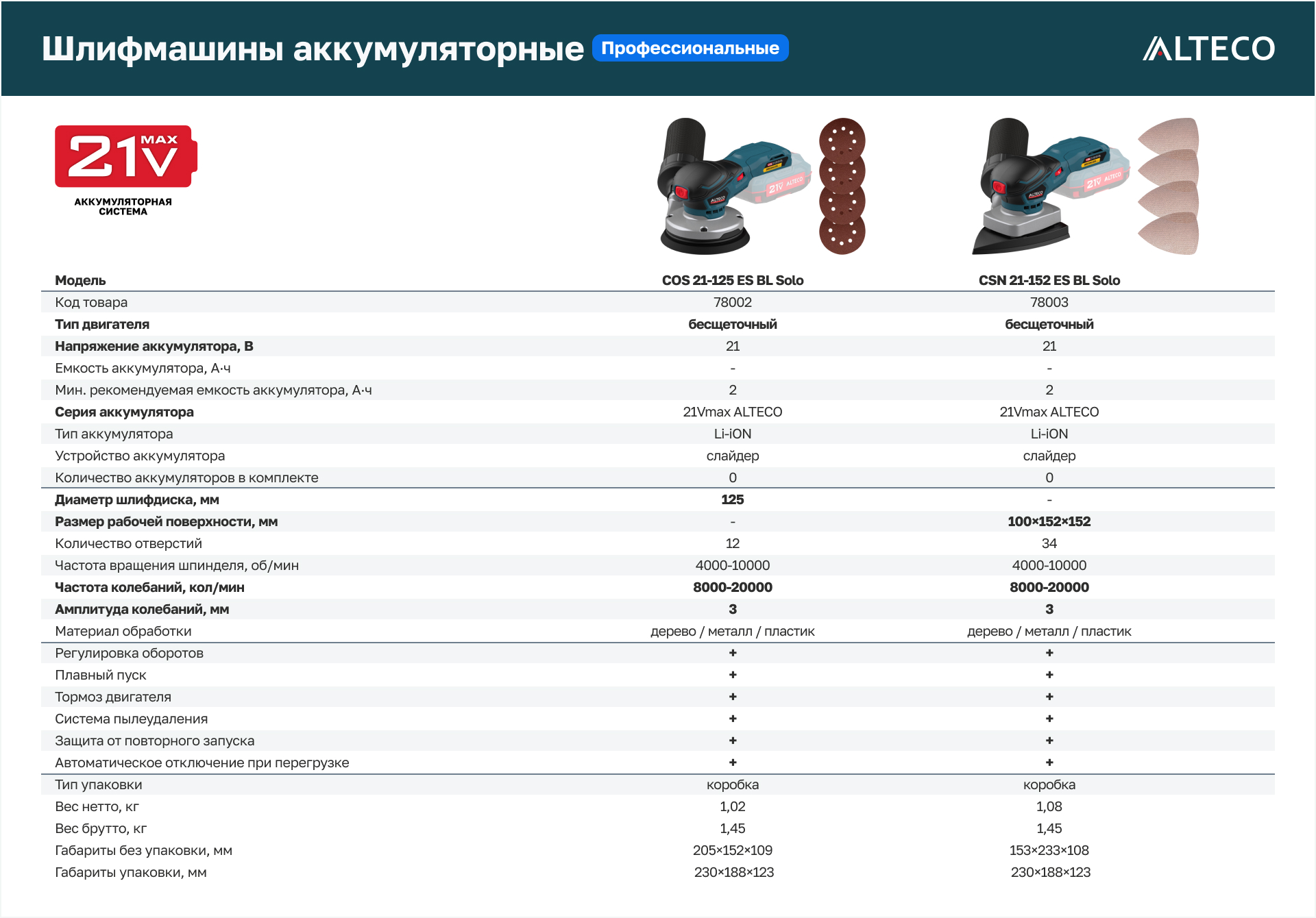 - Часть единой аккумуляторной системы ALTECO 21Vmax — один аккумулятор подходит для всех инструментов этой серии, обеспечивая удобство, экономию и гибкость в работе.