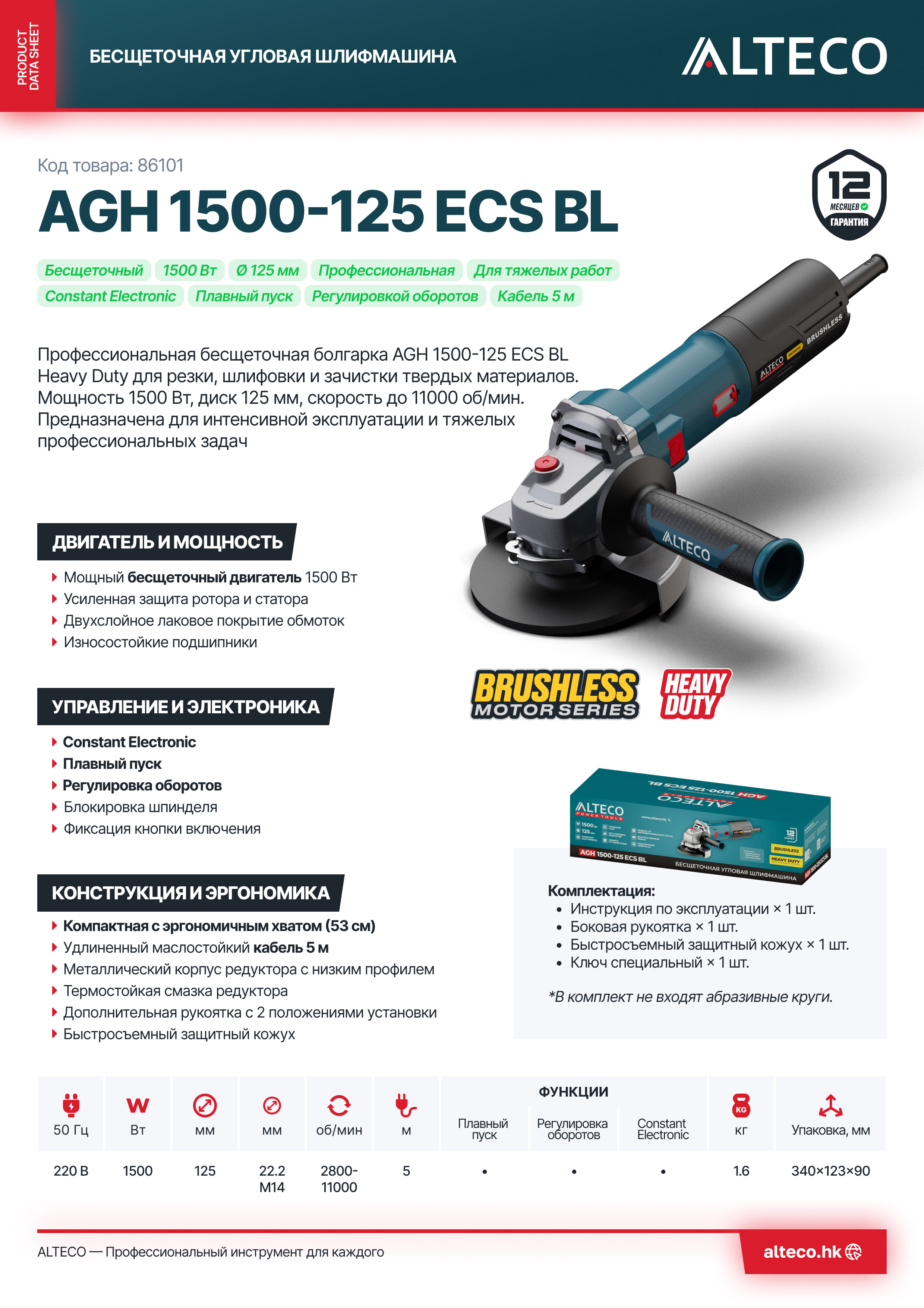 - Мощный бесщеточный двигатель 1500 Вт — увеличенный ресурс, стабильная работа под нагрузкой.